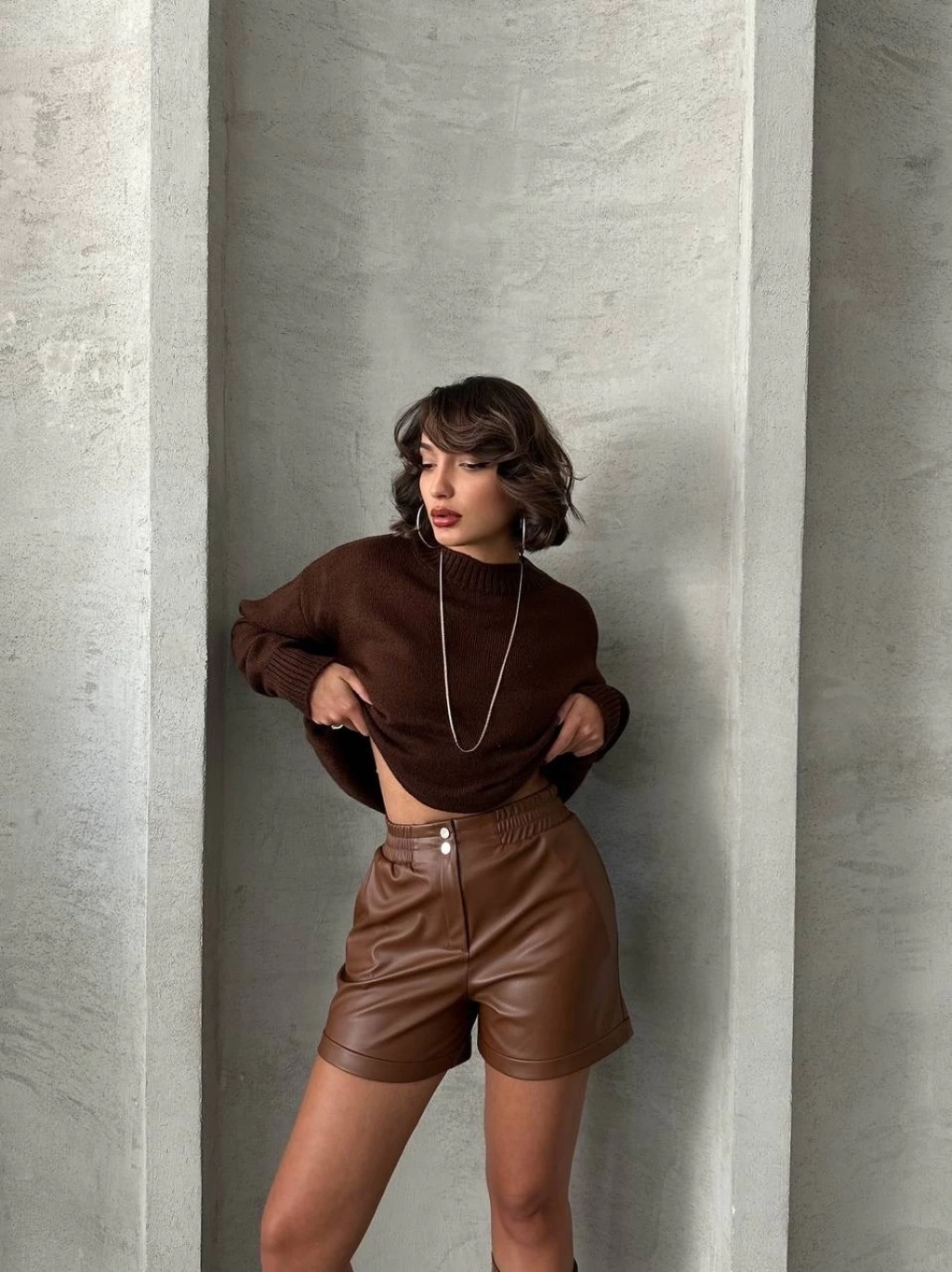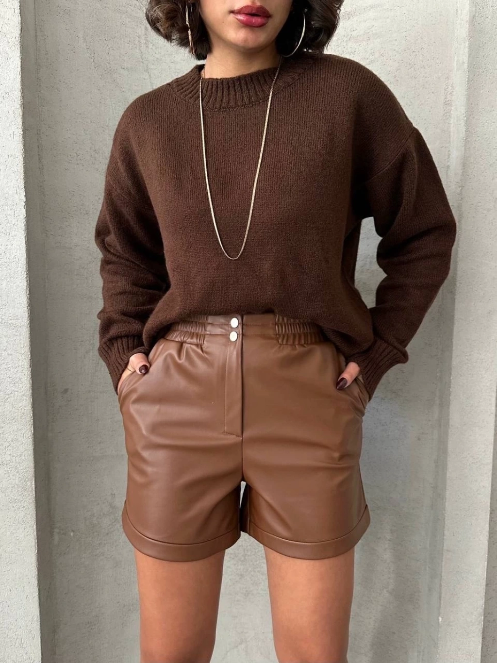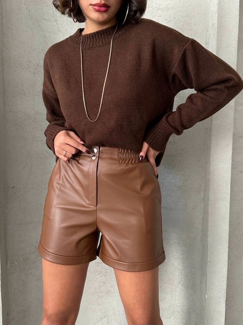 Şıklığı ve rahatlığı bir arada sunan Beli Lastikli Çıtçıtlı Deri Şort ile tarzınızı konuşturun. Kahve rengi ve deri dokusu ile şıklığı ön plana çıkan bu şort, günün her anında şık ve rahat bir görünüm sağlar.