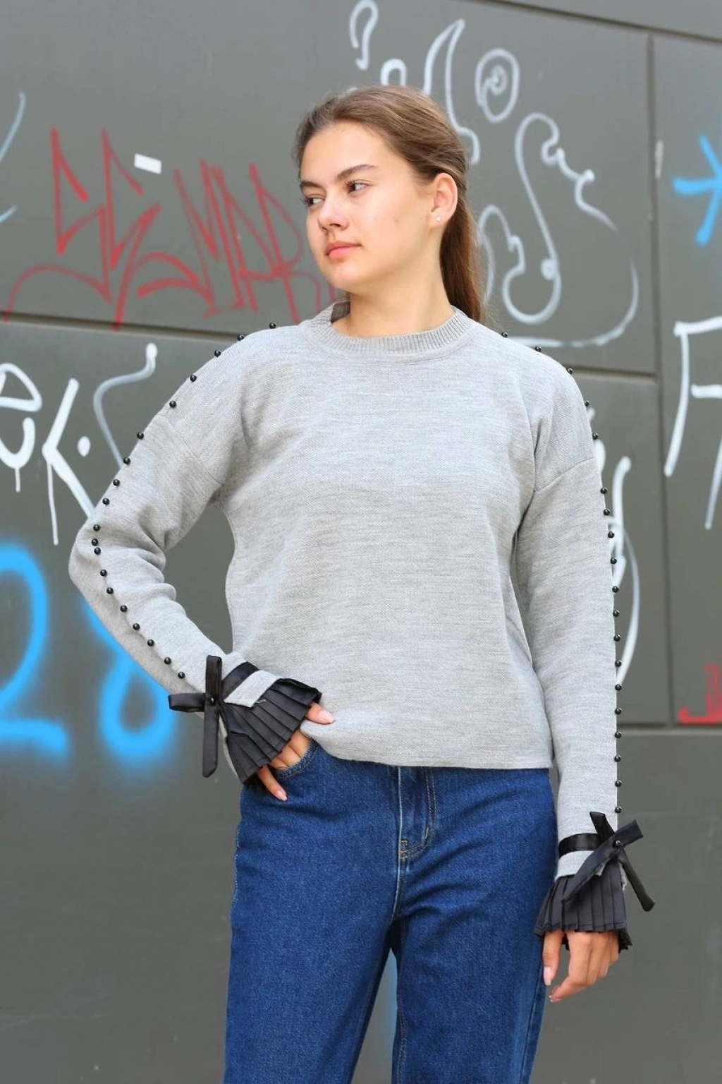 Şıklığı ve rahatlığı bir arada sunan Boncuklu Bile Detaylı Kazak Gri, gardırobunuzun vazgeçilmez parçalarından biri olmaya aday.