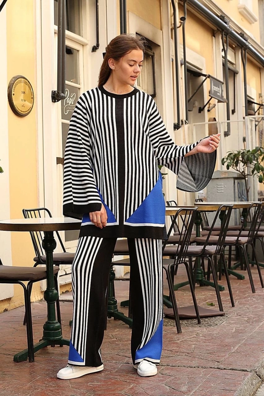 Bu çizgili bisiklet yaka triko takım siyah ile her yerde tarzınızı konuşturabilir, şıklığınızı ve rahatlığınızı ön plana çıkarabilirsiniz.
