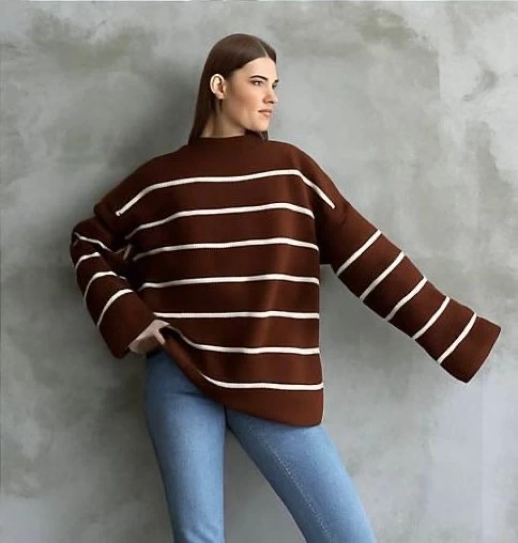 İspanyol tarzını yansıtan çizgili boğazlı triko kazak, gardırobunuzun vazgeçilmezi olmaya aday! Hem şık hem de rahat yapısıyla günlük kullanıma uygun olan bu kahve beyaz kazak, farklı kombinler oluşturmanıza olanak sağlar.