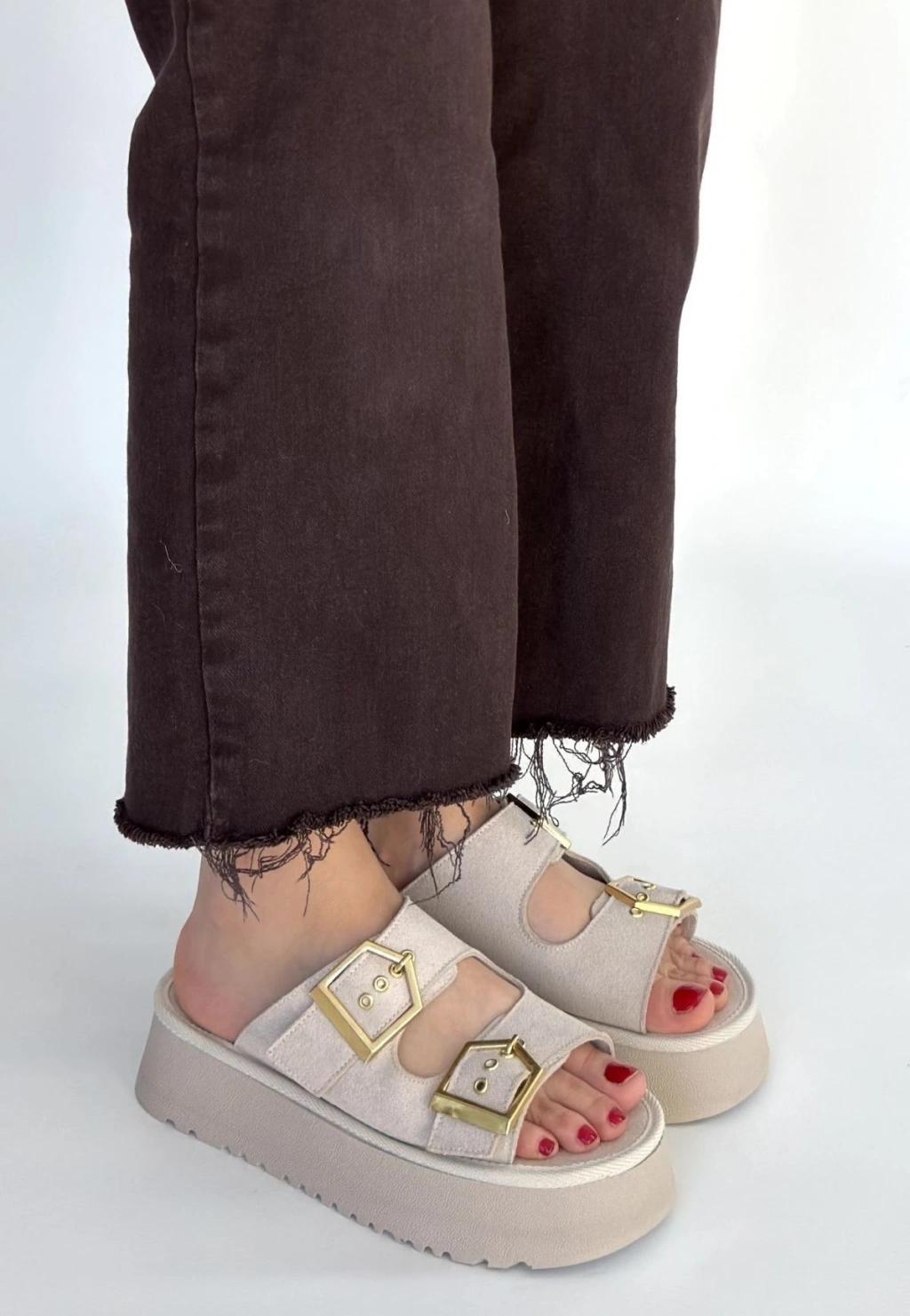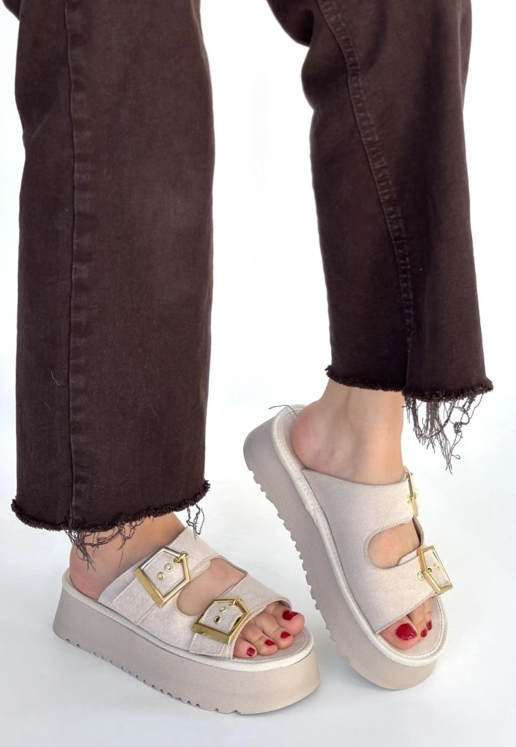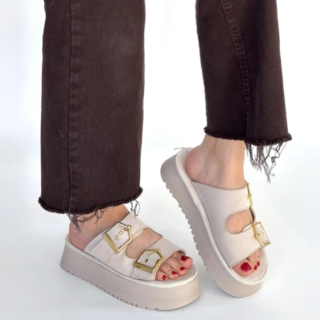 • Coer Bej Süet Çift Tokalı Terlik