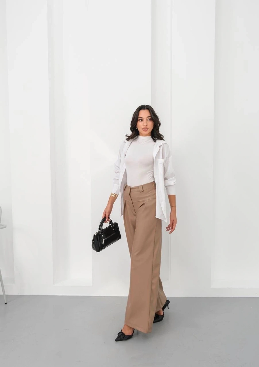Deri geniş paça beli lastikli pantolon bej h263644, hem şık hem de rahat bir seçenektir. İşte bu pantolonun öne çıkan özellikleri: