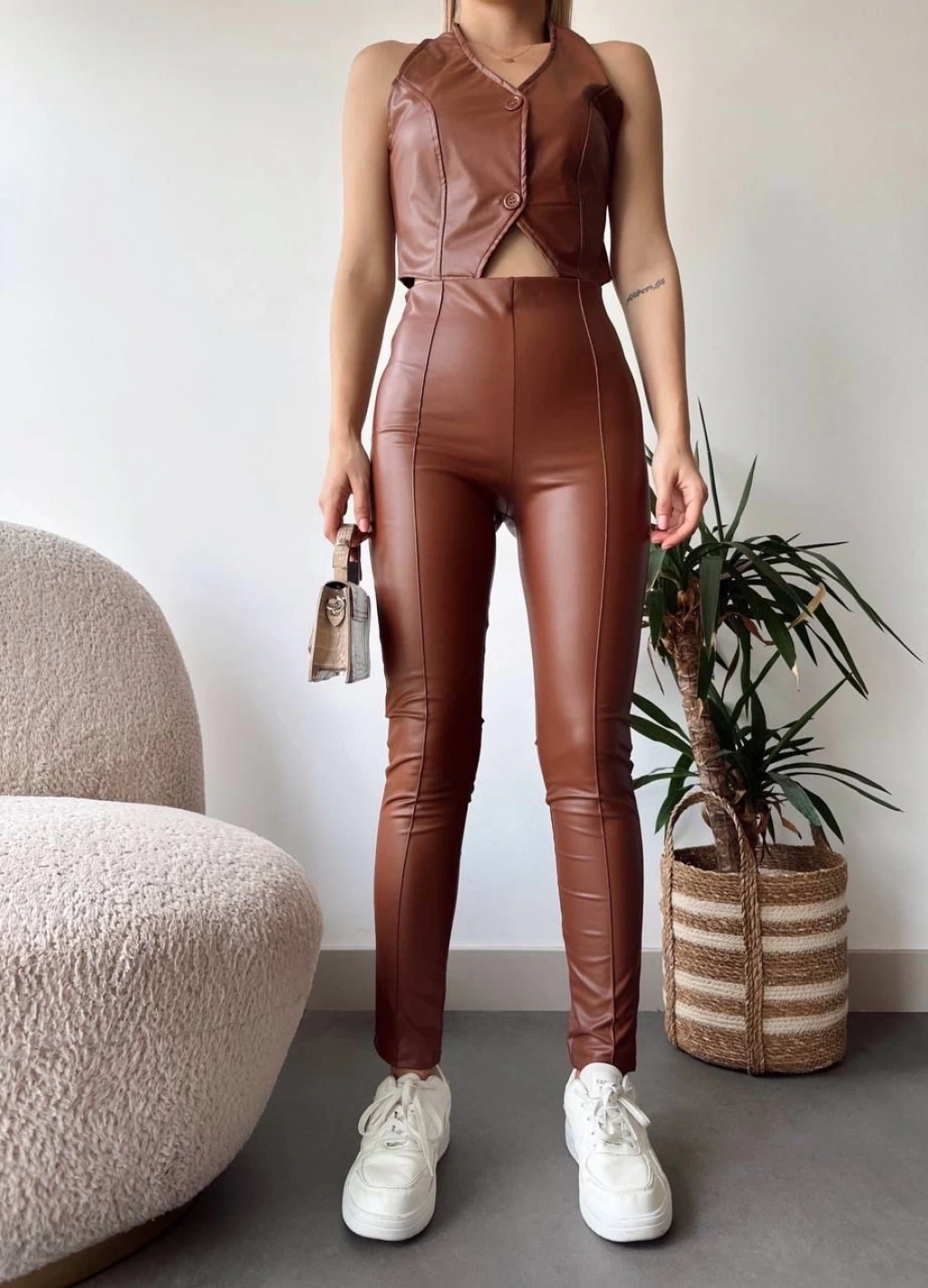 Şık ve modern tasarımıyla dikkat çeken Kahve rengi İki Düğmeli Deri Yelek, gardırobunuzun vazgeçilmezi olmaya aday!