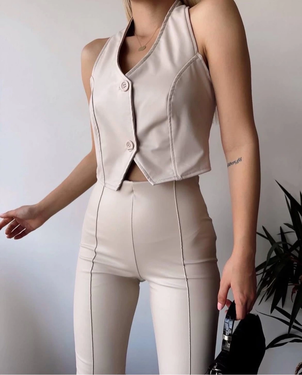 İki düğmeli deri yelek krem s243001, kadın giyim kategorisinde şıklık ve zarafet arayanların tercihi. İşte bu yeleğin özellikleri: