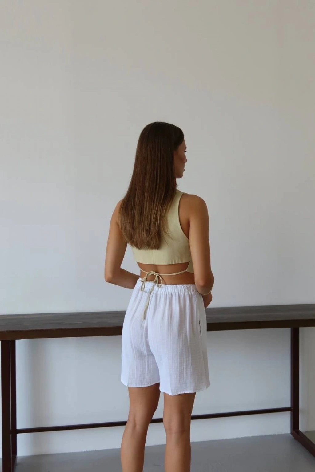 Kadınların yaz aylarında rahatlıkla tercih edebileceği şık ve şort modeli: Müslin kumaş şort bağcıklı beyaz PT!